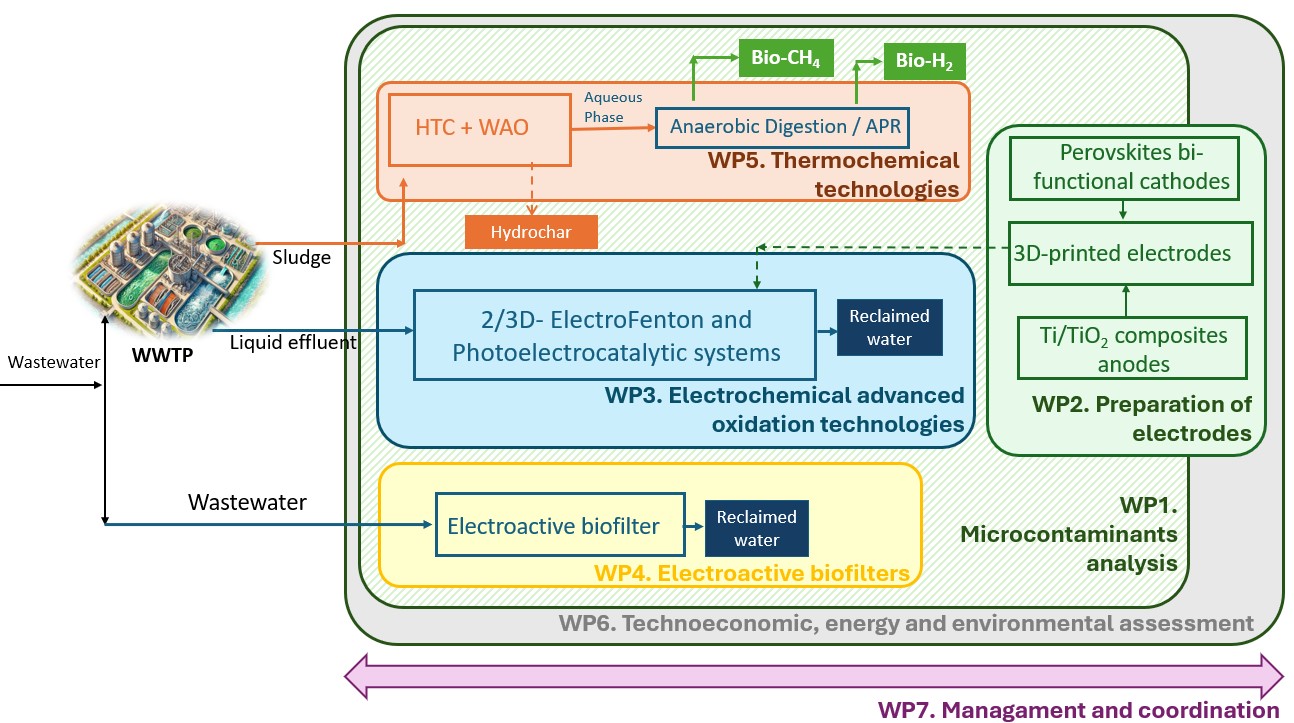 The work plan for the REMICROPOL project is structured into 7 Work Packages (WPs) that integrate different water waste treatment.